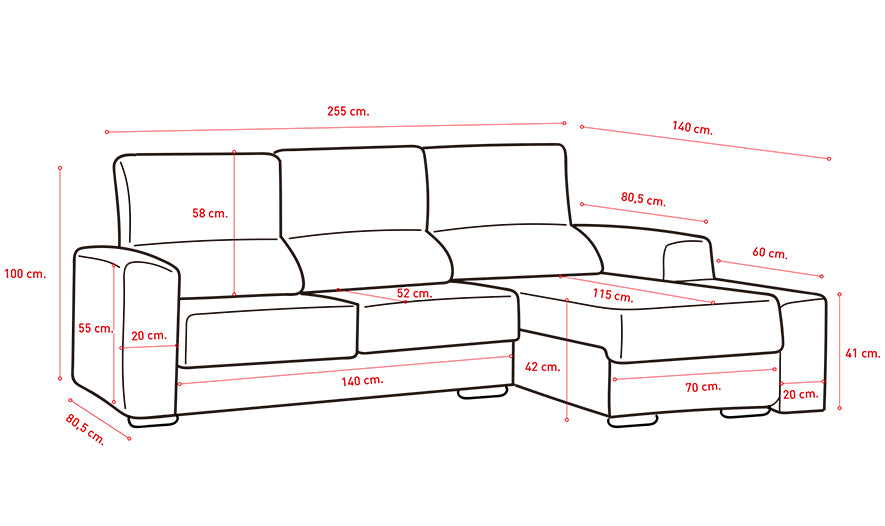 Dispone de asientos deslizantes y respaldos reclinables, que permiten ajustar la posición para un confort personalizado. Su chaise longue incorpora un práctico arcón para almacenaje, y en el brazo corto incluye un puff integrado, perfecto como asiento auxiliar o reposapiés.